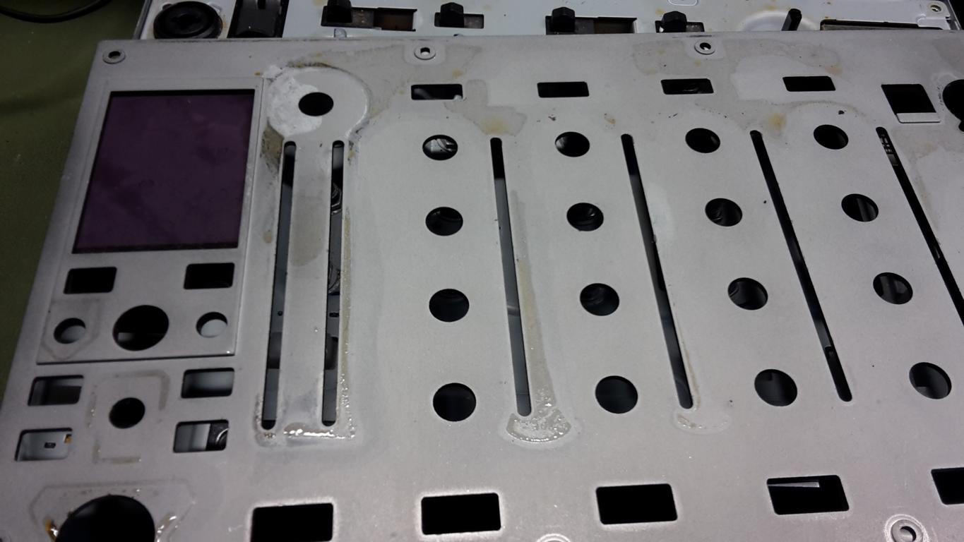 Der Pioneer DJM‑750 ist ein beliebter Club‑ und Homestudio‑Mixer, der normalerweise sehr zuverlässig läuft. Doch wie bei allen DJ‑Geräten gilt: Flüssigkeiten sind der größte Feind. Ein umgekipptes Getränk, Kondenswasser oder ein kleiner Spritzer an der falschen Stelle reichen aus, um massive Schäden zu verursachen. Genau das war bei diesem DJM‑750 passiert – mehrere Bereiche waren durch Flüssigkeit beeinträchtigt und mussten repariert werden.