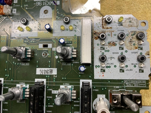 Bei diesem DJM‑900 NXS2 waren mehrere Bereiche durch Flüssigkeit beeinträchtigt. Nach der Reinigung, dem Austausch der betroffenen Komponenten und einer gründlichen Prüfung lief der Mixer wieder einwandfrei – ohne Knacken, ohne Aussetzer, ohne Risiko.