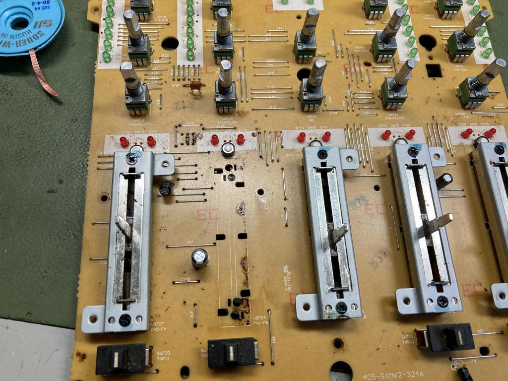 Sobald Feuchtigkeit ins Gerät gelangt, verteilt sie sich über Platinen, Tasten, Fader und Flex‑Kabel. Das führt zu Korrosion, Kontaktproblemen oder sogar kleinen Kurzschlüssen. Besonders empfindlich sind die Fader – sie reagieren sofort auf Feuchtigkeit und fangen an zu kratzen, springen oder fallen komplett aus. Wenn ein Kanal plötzlich stumm bleibt oder der Fader ungenau arbeitet, ist das ein klares Zeichen dafür, dass etwas nicht stimmt.